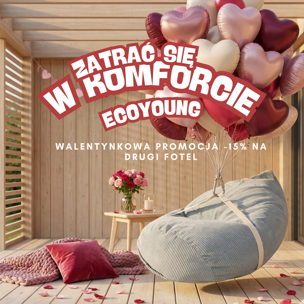 Witaj w manufakturze EcoYoung - miejscu, gdzie wygoda spotyka się z domowym ciepłem, a jakość idzie w parze z troską o każdy detal. Jesteśmy rodzinną firmą z Polski i już od prawie 20 lat tworzymy fotele i pufy, które umilają codzienny odpoczynek w domach, ogrodach i na tarasach w całym kraju.
